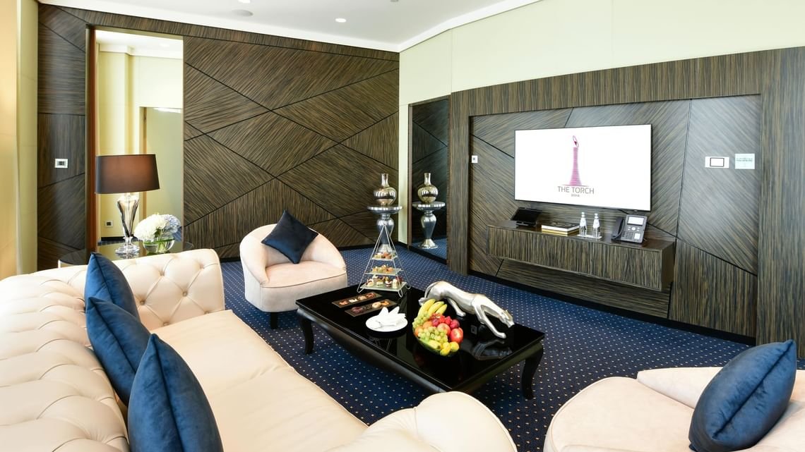 Boasting magnificent views of Aspire Zone and a modern interior, our Executive Suites offer 115 square metres of living space, including two master bedrooms or one master and one twin bedroom, two bathrooms, a living area, and a pantry. All the amenities feature earthy colour combinations and a modern, minimalistic interior design.